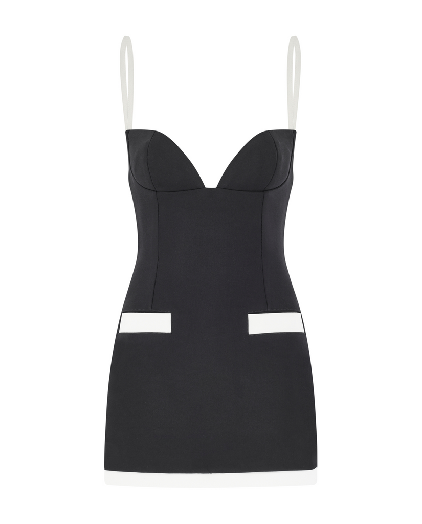 A beautifully crafted plunge neck dress, featuring adjustable straps, asandra studios classic monochrome details & hem