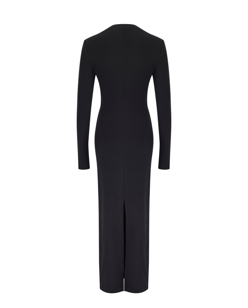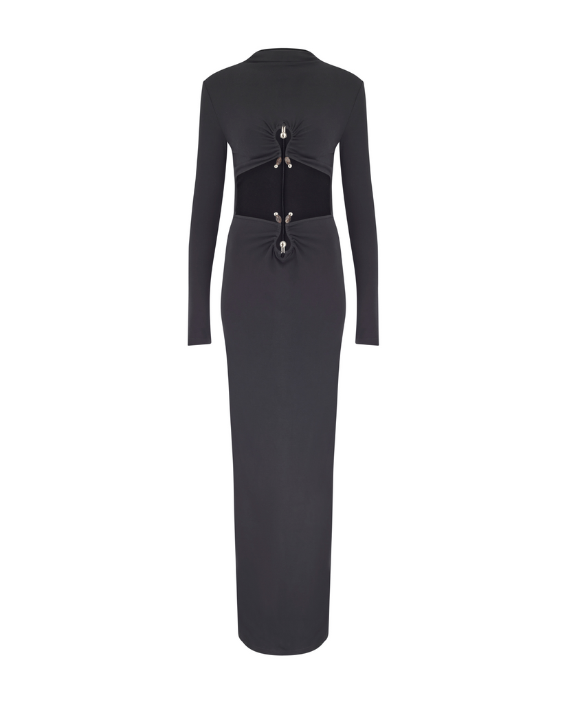 The soft stretch maxi dress with a cut out stomach, high neck & bead embellishment.
