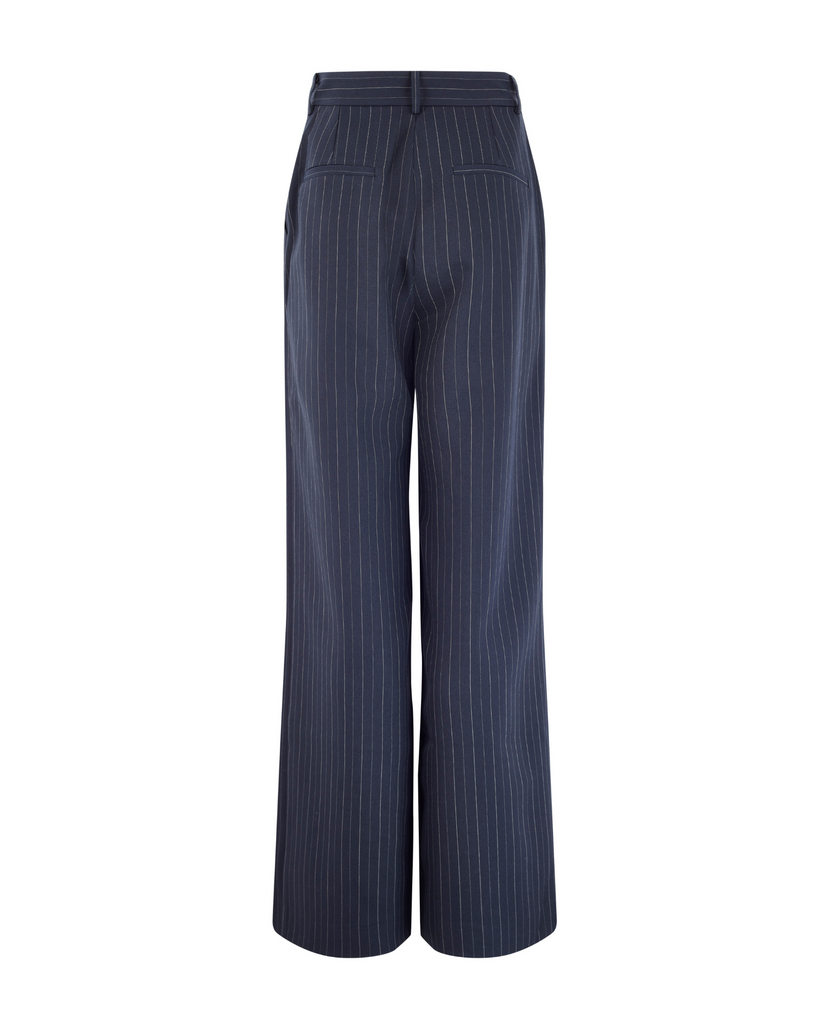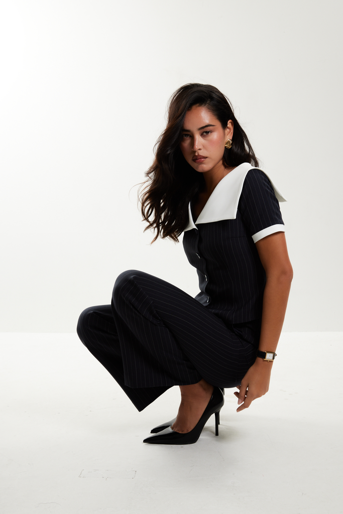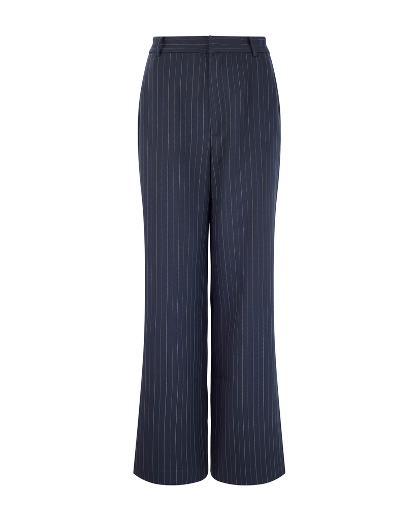 A classic navy pinstripe trouser, with a zip and clasp fastening, slim fit ane straight leg style, to pair perfectly with our Billie Jean top.