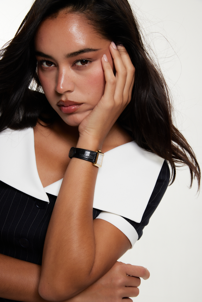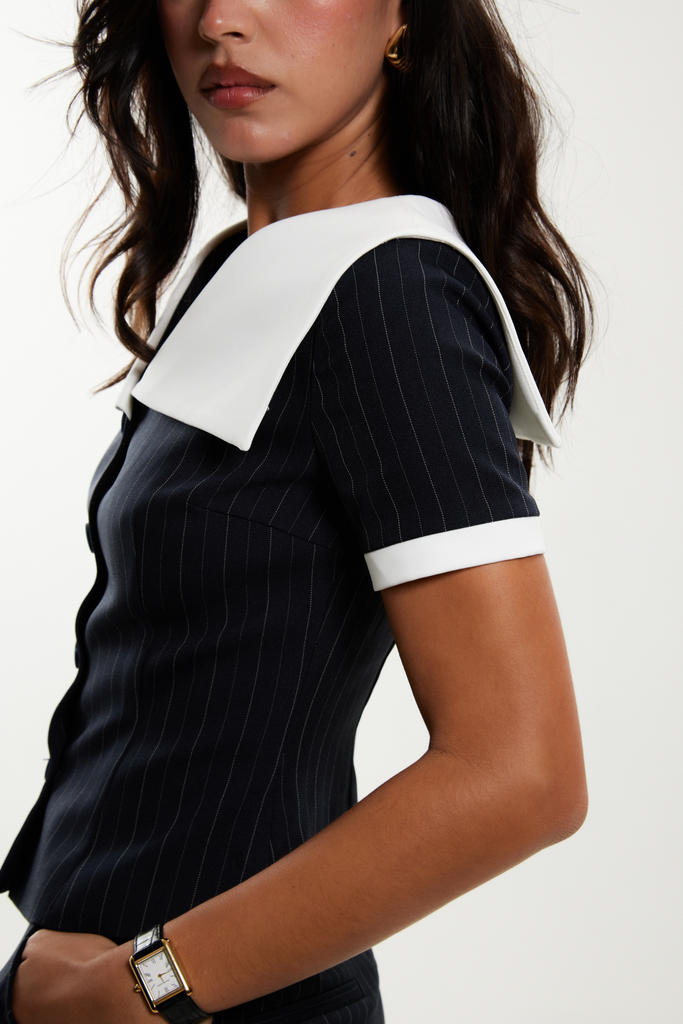 A chic elevated two piece, in a luxury navy pinstripe fabric and a structured white collar.