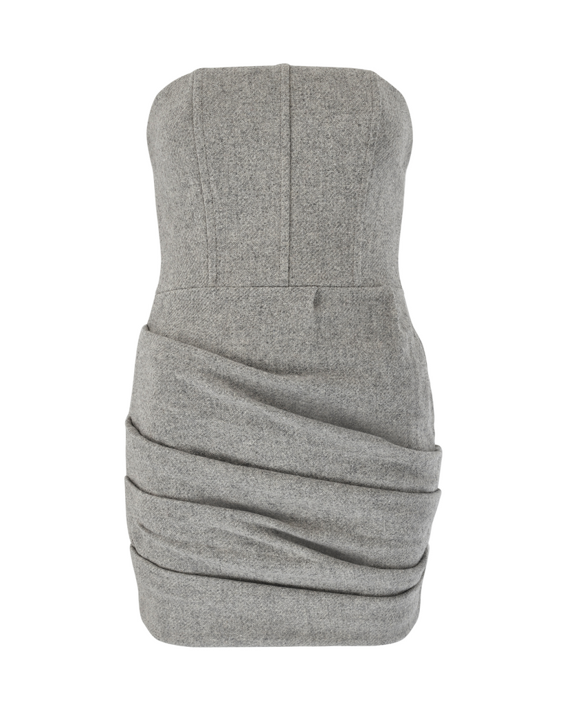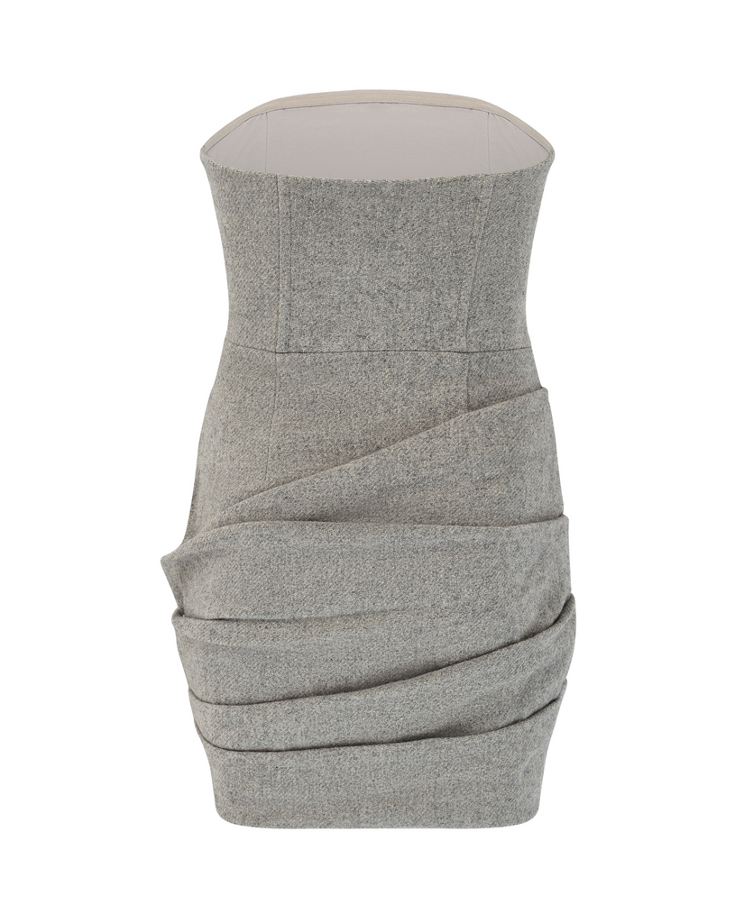 A wool drape dress, featuring a corset style bust and boning through the bodice.