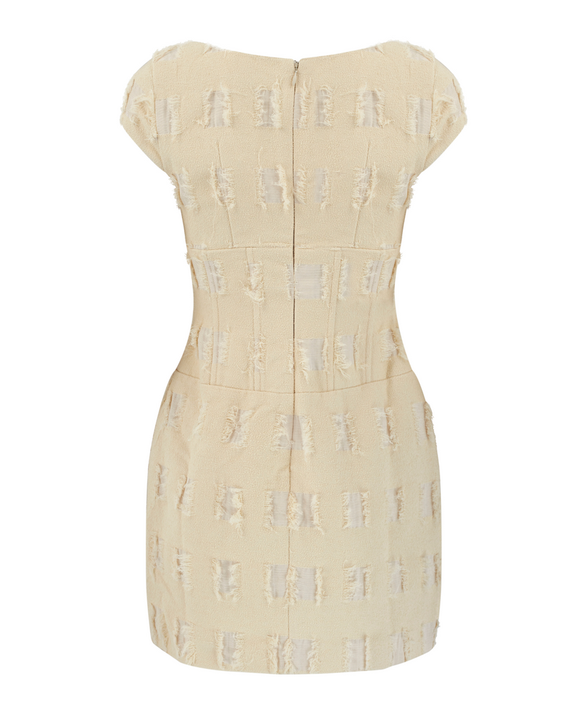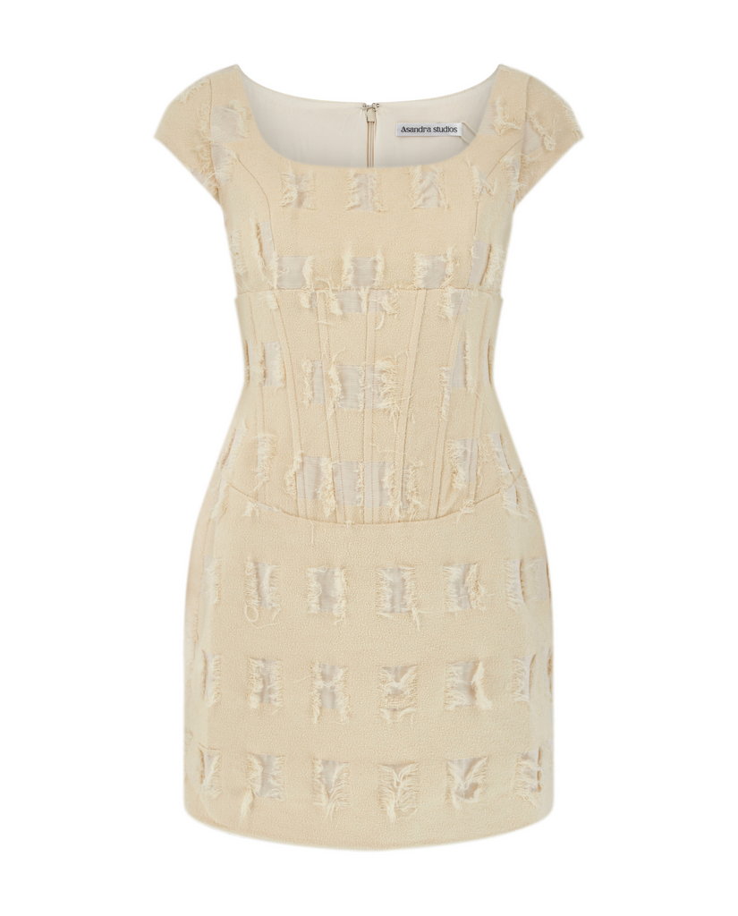The Evonne dress, a classic boat neck line with a cap sleeve, featuring a detailed and structured corset bodice, with boning to flatter the figure, customised with a unique Asandra Studios fabric.